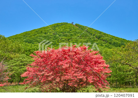 春の群馬県高崎市の榛名公園付近からツツジと榛名富士を見る