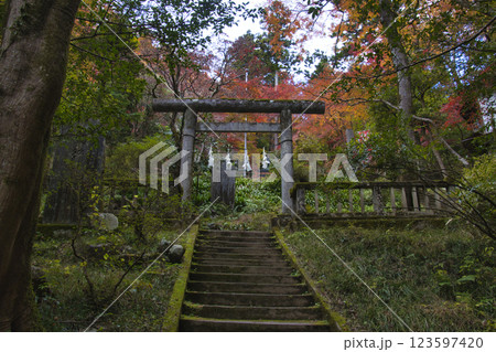 秩父御岳神社・東郷公園 参道の石段と鳥居と美しいもみじ 埼玉県飯能市