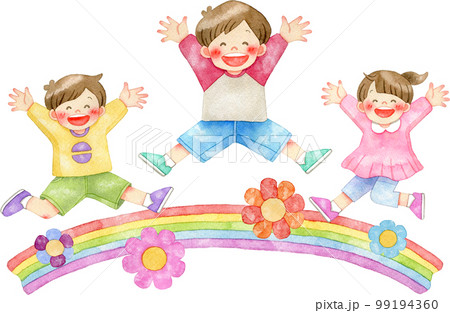 手足を広げて元気にジャンプをする子供たちと虹の水彩イラスト