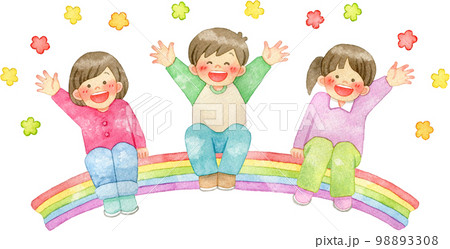 虹に座って手を振る笑顔の子供たちの水彩イラスト