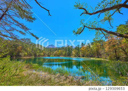 春の福島県耶麻郡の毘沙門沼(五色沼)の湖畔から新緑の展望(磐梯山,櫛ヶ峰,ボートなど)