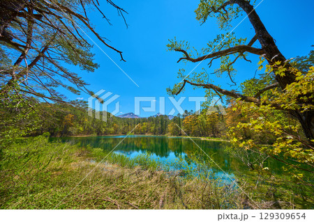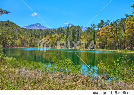 新緑の福島県 裏磐梯高原のるり沼と南側の櫛ヶ峰、磐梯山