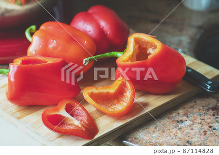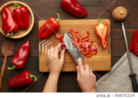 woman cuts red bell pepper into pieces on wooden board, brown wooden table