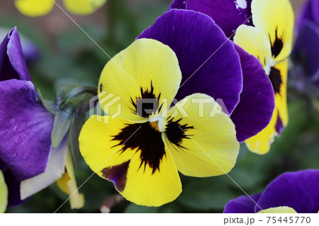早春の花壇に咲く黄色、紫、こげ茶色の複色のパンジーの花
