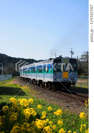 菜の花に見送られて駅を発車する久留里線キハ38形気動車_2009/3/20