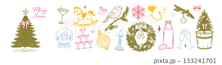 Whimsical Christmas festive sketch set. Hand drawn holiday icons. Tree, cocktail, snow globe, chandelier, bird, wreath, bows and winter decor for vintage celebration and cozy invitations.