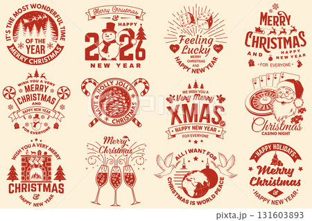 Merry Christmas and Happy New Year stamp, sticker, patch. Vintage print, logo, badge design with Santa Claus, Elf, casino dice, snowman, poker playing card, slot machines and sweet candy cane. Vector