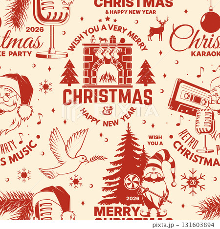 Merry Christmas and Happy New Year seamless pattern or background. stamp, sticker set with trees, Santa and Elf. Vector. Vintage wallpaper for xmas with new year emblem in retro style