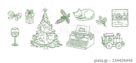 Hand drawn christmas holiday collection, cozy winter typewriter, decorated tree, sleeping cat, steam train toy, festive home decor, vector