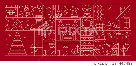 Christmas holiday line background with xmas ornament. Vector festive decorative pattern with outline fireplace, wreath, stockings, candles and snowflakes, tree, gifts and seasonal winter landscape