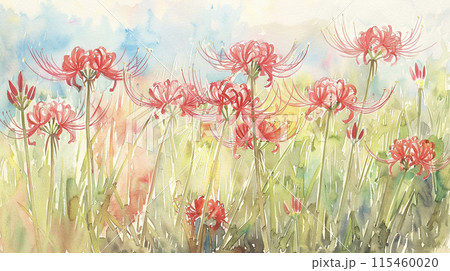 赤い彼岸花の水彩画の背景 秋 フレーム コピースペース 手描き 水彩 イラスト素材