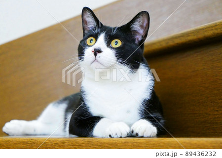 階段で聞き慣れない音に驚いている猫