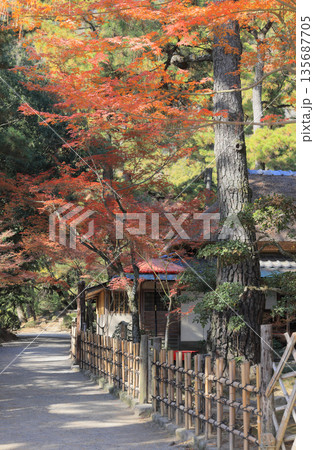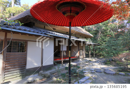 栗林公園南庭、草庵型の茶室日暮亭の紅葉