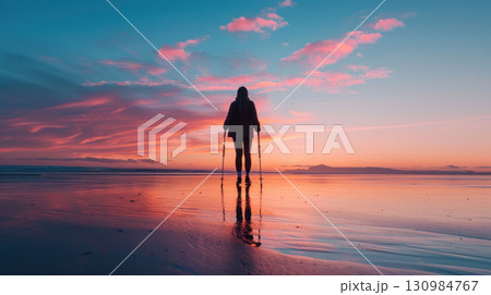 Woman with crutches at beach, sunset, serene look, wide shot, vibrant hues