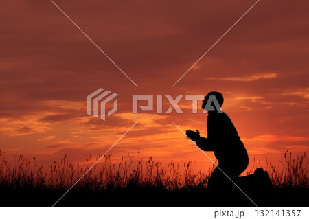Man Kneeling in Prayer Against a Sunset Backdrop in a Peaceful Landscape