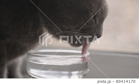 Shot of gray cat drinking fresh water from glass goblet on a windowsill