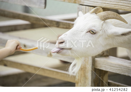 ヤギに餌やり