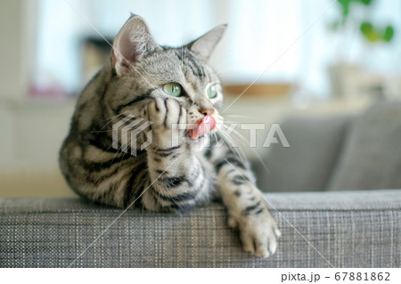 ペロリと舌を出してグルーミングする猫のしぐさ 茶トラ短足マンチカン