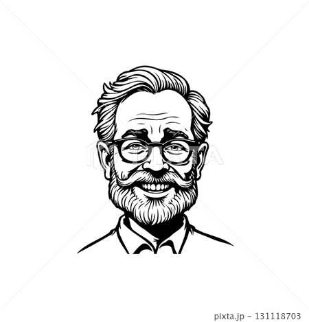 Detailed black and white line art portrait of a smiling senior man with glasses