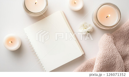 Close-up of laptop with blank white screen, lit candle in jar, and a white mug surrounded by chunky, warm, knitted blankets and cozy fabric curtains. Soft, out-of-focus bokeh lights in background