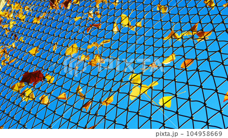 公園の網に引っ掛かったイチョウの黄葉と青空の風景