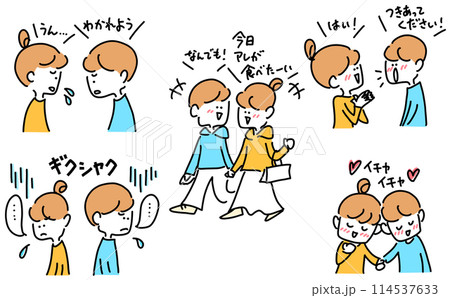 漫画風 恋する男女の交際から別れまで 告白 デート ギクシャク 別れ シンプルで可愛い線画イラスト