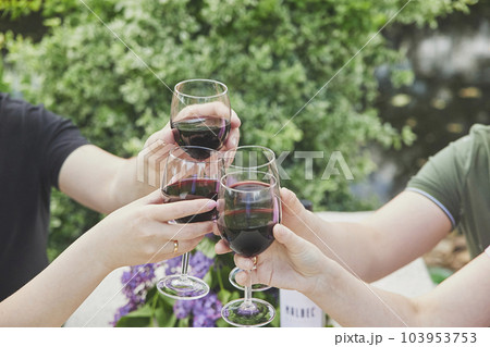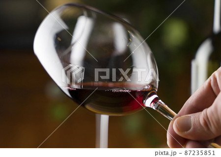 Wine tasting. A glass of red wine on the background of a restaurant table with bottle at an evening dinner or event party.