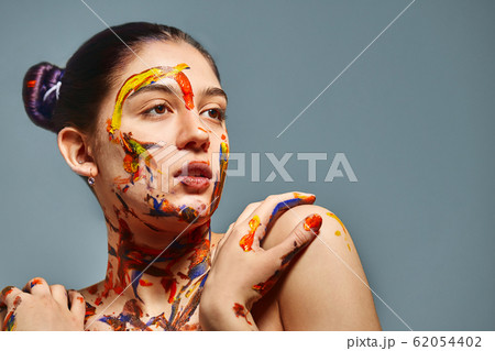 Portrait of a beautiful girl in the paint. Closeup portrait of a girl with face and hands with different paint. Fashion art concept, beauty, creative people freelance people