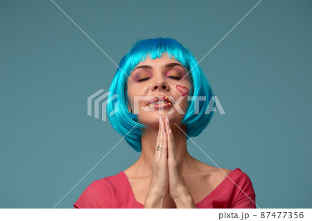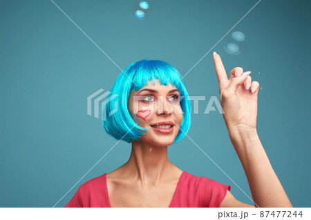 Beautiful young woman with blue wig and bright make-up in soap bubbles hands holds at the chin makes a wish with closed eyes. Fashion model girl with creative color makeup. Women doll concept.