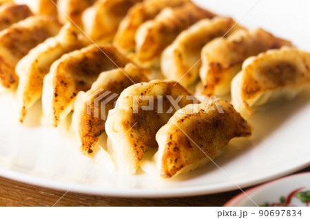 白い皿に盛られた餃子・博多名物ひとくち餃子・おいしい餃子の皿盛り