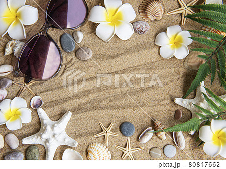 Sand shells background. Summer time concept with sea shells and starfish on the sand