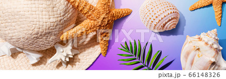 Summer time concept Flat lay composition with beautiful starfish and sea shells on colored table, top view with copy space for text