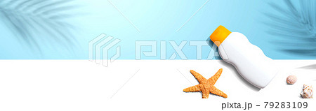 Towel, hat, sunglasses, sunscreen and starfish on a blue wooden background with copy space