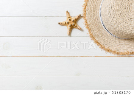 Summer vacation concept flat lay. straw hat beach accessories and flip flop top view. Space for text. travel concept