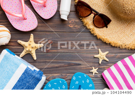 Summer vacation concept flat lay. straw hat beach accessories and towel top view. Space for text. travel concept