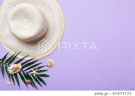 Beach accessories: glasses and hat with shells and sea stars on a colored background