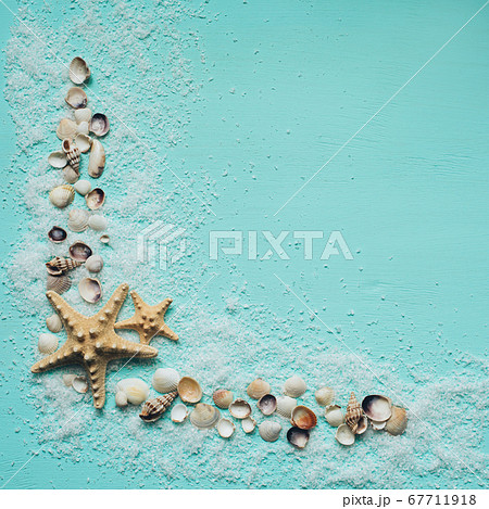Summer time concept with blank greeting card and blank craft paper on colored background. Seashells from ocean shore in the shape of frame separated with space for text top view