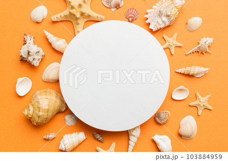 Summer time concept with blank greeting card and blank white paper on colored background. Seashells from ocean shore in the shape of frame separated with space for text top view