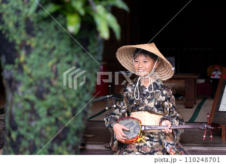 沖縄の民族衣装を着て三線を引く男の子