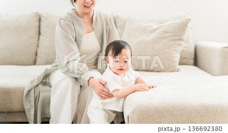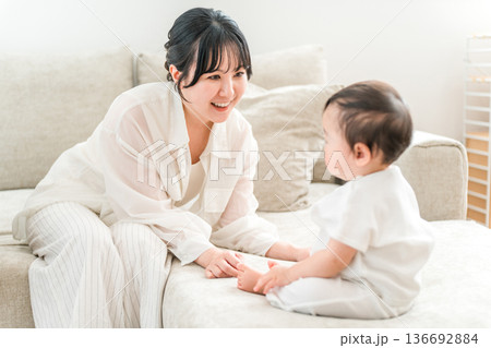 家のリビングで赤ちゃんと遊ぶ母親(シングルマザー,ひとり親,母子家庭)