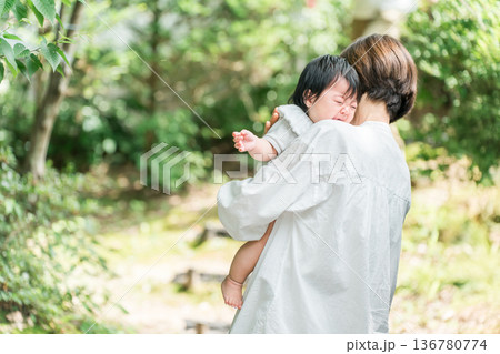 ぐずる赤ちゃんを抱っこしてあやす女性,母親