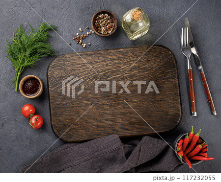 Background with dark cutting board, sauce, spices, herbs and chili peppers on dark kitchen table.