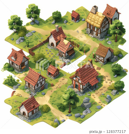 Village with houses, isometric, 2D game map, white background, simple style. Art design enhances casual gaming vibe.