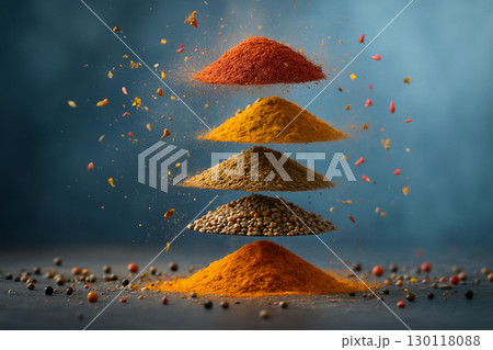 AI generated vibrant food photography of colorful spices floating in midair with powders and herbs scattering like a magical burst of flavor energy against a soft background
