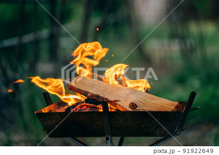 夏のキャンプで焚き火をする男性(夜・夕方)