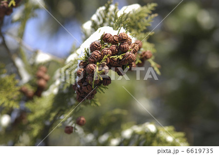 ヒバの実に雪