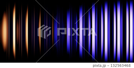 Neon ribbed fractal glass texture on black 3d background. Abstract vertical stripe pattern with glowing gold blue violet gradient. Sound wave pulse music light effect, night party bg. 3D illustration