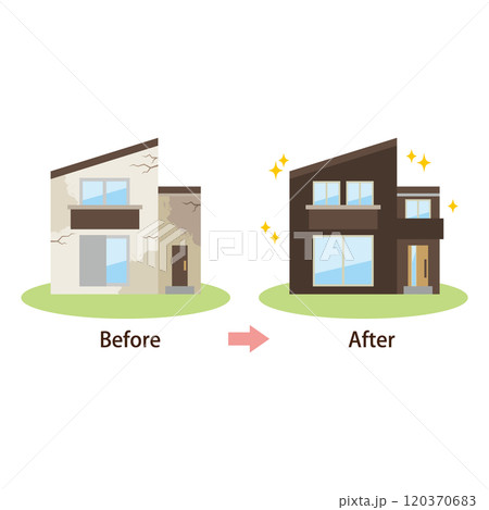 古くて薄汚れた家とリフォームされてピカピカの家のイラスト(主線なし)