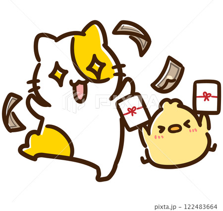 お金に目が眩みはしゃぐかわいいねこのひよこのキャラクターのデフォルメイラスト