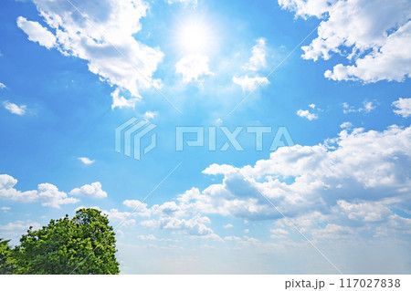 夏の雲と太陽と木立
